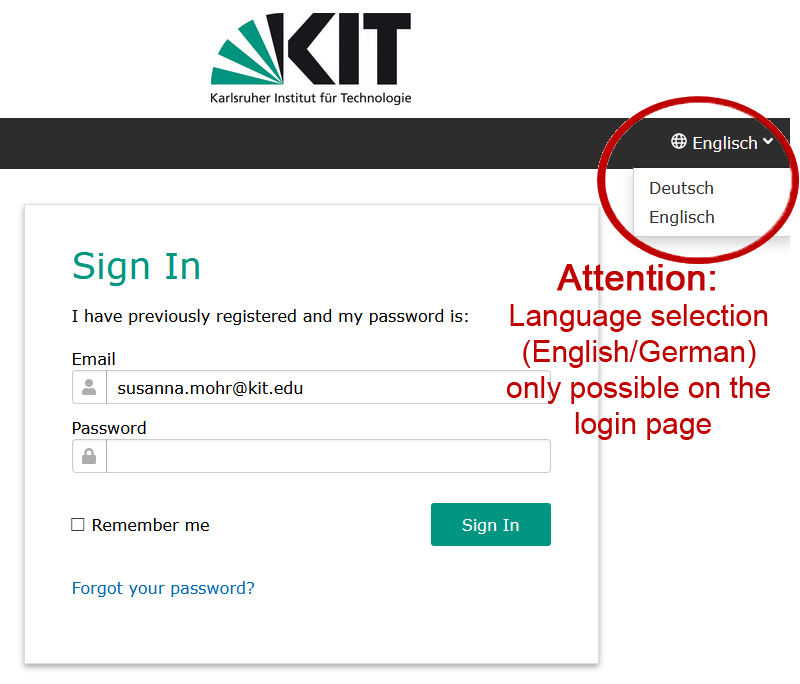 - Register for the abstract management system of the KIT and log in (Note: Language selection (English/German) only possible on the login page).